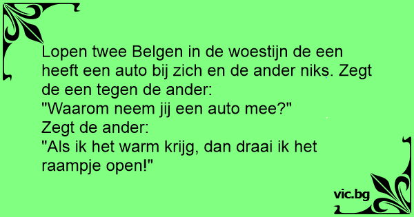 Lopen twee Belgen in de woestijn de een heeft een auto bij zich en de ander niks. Zegt de een tegen de ander:
