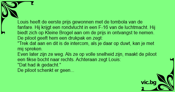 Louis heeft de eerste prijs gewonnen met de tombola van de fanfare. Hij krijgt een rondvlucht in een F-16 van de luchtmacht. Hij biedt zich op Kleine Brogel aan om de prijs in ontvangst te nemen. De piloot geeft hem een drukpak en zegt: