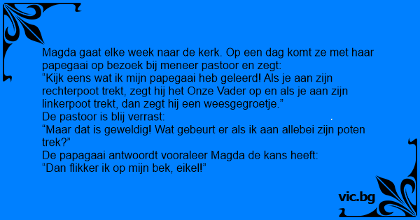 Een meneer komt in de dierenwinkel Hij ziet een papegaai. Hij vraagt aan de verkoper : kan die papegaai ook praten? De verkoper zegt : ja als je aan z'n linkerpootje trekt zegt hij:goedemorgen!, En...