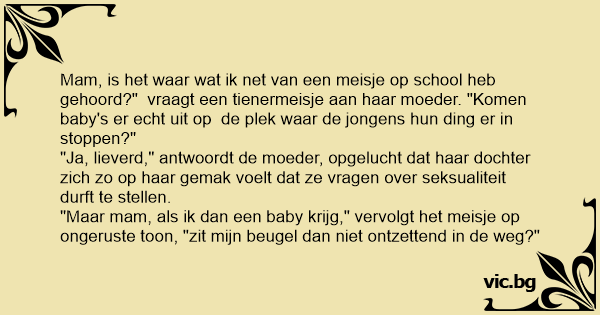 Mam, is het waar wat ik net van een meisje op school heb gehoord?" vraagt een tienermeisje aan haar moeder. "Komen baby's er echt uit op de plek waar de jongens hun ding er in stoppen?"