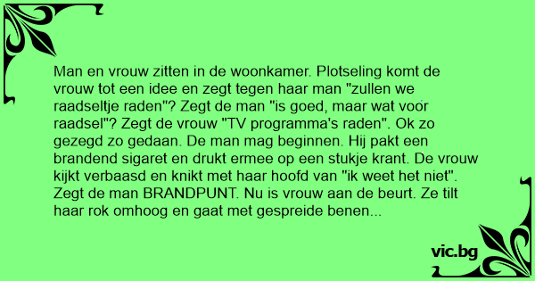 Man en vrouw zitten in de woonkamer. Plotseling komt de vrouw tot een idee en zegt tegen haar man "zullen we raadseltje raden"? Zegt de man "is goed, maar wat voor raadsel"? Zegt de vrouw "TV programma's raden". Ok zo gezegd zo gedaan. De man mag beginnen. Hij pakt een brandend sigaret en drukt ermee op een stukje krant. De vrouw kijkt verbaasd en knikt met haar hoofd van "ik weet het niet". Zegt de man BRANDPUNT. Nu is vrouw aan de beurt. Ze tilt haar rok omhoog en gaat met gespreide benen op de grond liggen. De man kijkt verbaasd naar haar, denkt even na en zegt van "ik weet het niet". Zegt de vrouw HIER EN NU.