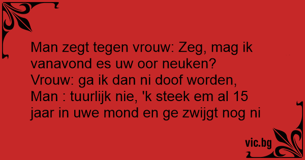 Een man komt thuis van zijn werk en roept zijn vrouw bij zich. "Schatje" zegt hij " mag ik hem eens in jou oor steken ?" "In mijn oor ?!?" zegt de vrouw verontwaardigd "nee je mag hem niet in mijn...