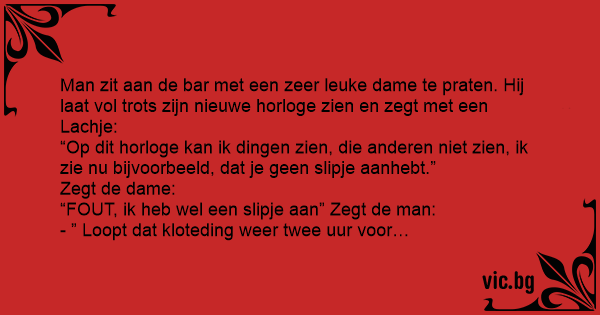 Man zit aan de bar met een zeer leuke dame te praten. Hij laat vol trots zijn nieuwe horloge zien en zegt met een