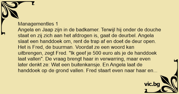 Angela en Jaap zijn in de badkamer. Terwijl hij onder de dоuсhе staat en zij zich aan het afdrogen is, gaat de deurbel. Angela slaat een handdoek om, rent de trap af en doet de deur open. Het is Fred, de buurman. Voordat ze een woord kan uitbrengen, zegt Fred. "Ik geef je 500 euro als je de handdoek laat vallen". De vraag brengt haar in verwarring, maar even later denkt ze: Wat een buitenkansje. En Angela laat de handdoek op de grond vallen. Fred staart even naar haar en geeft haar een biljet van 500 euro. Angela drapeert de handdoek weer om zich heen en gaat terug naar de badkamer. "Wie was dat? "vraagt Jaap." Fred, de buurman," antwoordt Angela. "Aha," zegt Jaap, "zei hij nog iets over de 500 euro die hij me schuldig is?"
