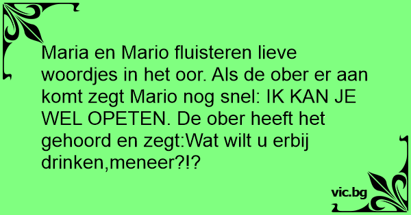 Maria en Mario fluisteren lieve woordjes in het oor. Als de ober er aan komt zegt Mario nog snel: IK KAN JE WEL OPETEN. De ober heeft het gehoord en zegt:Wat wilt u erbij drinken,meneer?!?