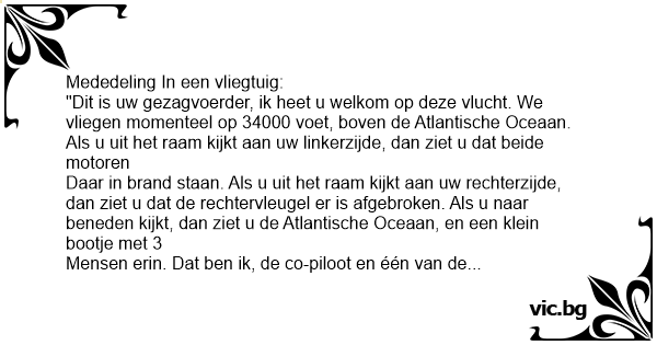 "Dit is uw gezagvoerder, ik heet u welkom op deze vlucht. We vliegen momenteel op 34000 voet, boven de Atlantische Oceaan. Als u uit het raam kijkt aan uw linkerzijde, dan ziet u dat beide motoren