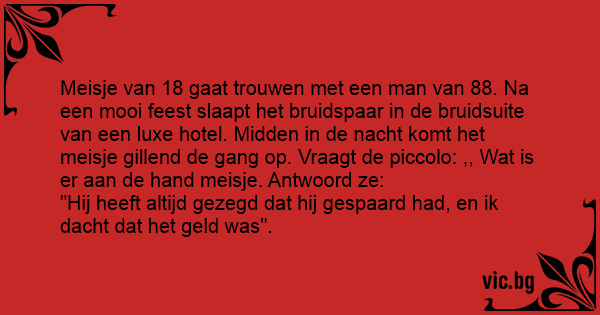 Meisje van 18 gaat trouwen met een man van 88. Na een mooi feest slaapt het bruidspaar in de bruidsuite van een luxe hotel. Midden in de nacht komt het meisje gillend de gang op. Vraagt de piccolo: ,, Wat is er aan de hand meisje. Antwoord ze: