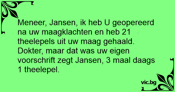 Meneer, Jansen, ik heb U geopereerd na uw maagklachten en heb 21 theelepels uit uw maag gehaald. Dokter, maar dat was uw eigen voorschrift zegt Jansen, 3 maal daags 1 theelepel.