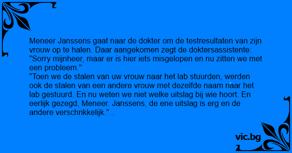 Meneer Janssens gaat naar de dokter om de testresultaten van zijn vrouw op te halen. Daar aangekomen zegt de doktersassistente: