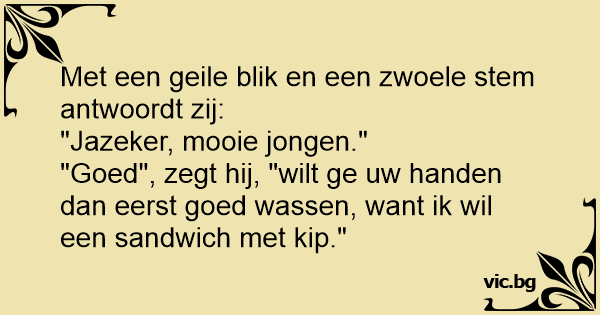 "Goed", zegt hij, "wilt ge uw handen dan eerst goed wassen, want ik wil een sandwich met kip."