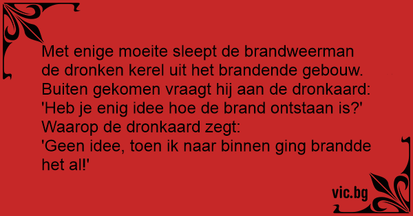 Met enige moeite sleept de brandweerman de dronken kerel uit het brandende gebouw. Buiten gekomen vraagt hij aan de dronkaard: