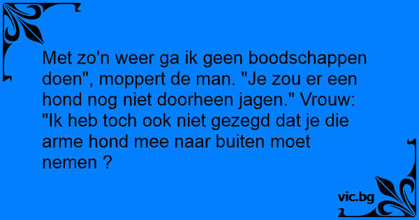 Met zo'n weer ga ik geen boodschappen doen", moppert de man. "Je zou er een hond nog niet doorheen jagen." Vrouw:
