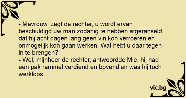 - Mevrouw, zegt de rechter, u wordt ervan beschuldigd uw man zodanig te hebben afgeranseld dat hij acht dagen lang geen vin kon verroeren en onmogelijk kon gaan werken. Wat hebt u daar tegen in te brengen?