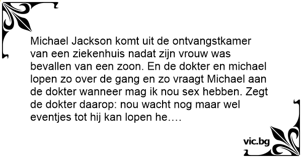 Michael Jackson komt uit de ontvangstkamer van een ziekenhuis nadat zijn vrouw was bevallen van een zoon. En de dokter en michael lopen zo over de gang en zo vraagt Michael aan de dokter wanneer mag ik nou sеx hebben. Zegt de dokter daarop: nou wacht nog maar wel eventjes tot hij kan lopen he….