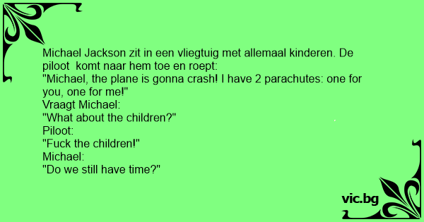 Лети Майкъл Джексън с частния си самолет и група дечица из небето. По едно време пилота го извикал и му казва: - Самолета се повреди, пък имаме само два парашута. Вземай единия и скачай. - Ами...
