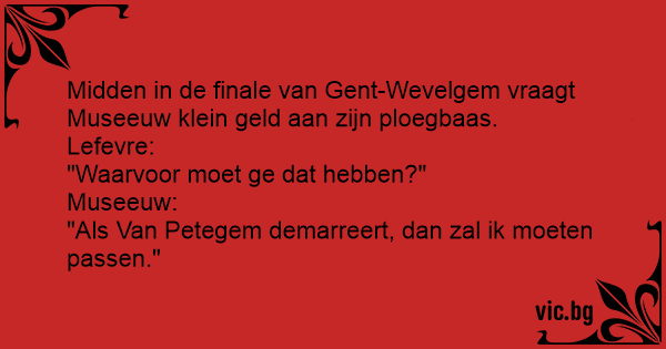 Midden in de finale van Gent-Wevelgem vraagt Museeuw klein geld aan zijn ploegbaas.<br />Lefevre:<br />"Waarvoor moet ge dat hebben?"<br />Museeuw:<br />"Als Van Petegem demarreert, dan zal ik moeten passen."