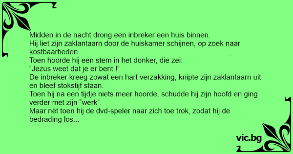 Een inbreker sluipt door een donkere huiskamer, op zoek naar buit. Plotseling hoort hij een stem "Jezus houdt u in de gaten". De inbreker schrikt zich een ongeluk en verstopt zich achter een...