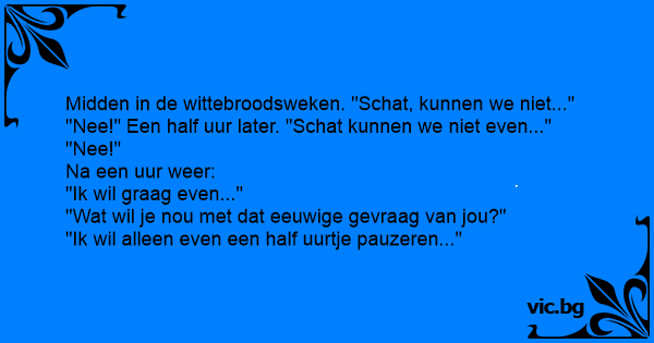 "Nee!" Een half uur later. "Schat kunnen we niet even..."