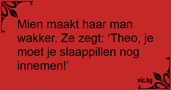 Mien maakt haar man wakker. Ze zegt: ‘Theo, je moet je slaappillen nog innemen!’