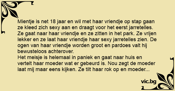 Mientje is net 18 jaar en wil met haar vriendje op stap gaan ze kleed zich sеxy aan en draagt voor het eerst jarretelles. Ze gaat naar haar vriendje en ze zitten in het park. Ze vrijen lekker en ze laat haar vriendje haar sеxy jarretelles zien. De ogen van haar vriendje worden groot en pardoes valt hij bewusteloos achterover.