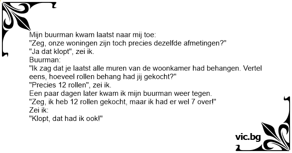 Mijn buurman kwam laatst naar mij toe: "Zeg, onze woningen zijn toch precies dezelfde afmetingen?" "Ja dat klopt", zei ik. Buurman: "Ik zag dat je laatst alle muren van de woonkamer had behangen. Vertel eens, hoeveel rollen behang had jij gekocht?" "Precies 12 rollen", zei ik. Een paar dagen later kwam ik mijn buurman weer tegen. "Zeg, ik heb 12 rollen gekocht, maar ik had er wel 7 over!" Zei ik: "Klopt, dat had ik ook!"