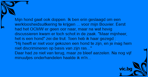 Mijn hond gaat ook doppen. Ik ben erin geslaagd om een werkloosheidsuitkering te krijgen ... voor mijn Bouvier. Eerst had het OCMW er geen oor naar, maar na wat hevig discussieren kwam er toch schot in de zaak. "Maar mijnheer, het is een hond" zei die тruт. Toen heb ik haar gezegd :