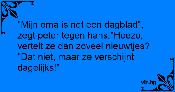 "Mijn oma is net een dagblad", zegt peter tegen hans."Hoezo, vertelt ze dan zoveel nieuwtjes? "Dat niet, maar ze verschijnt dagelijks!"
