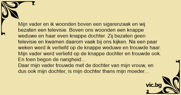 Mijn vader en ik woonden boven een sigarenzaak en wij bezaten een televisie. Boven ons woonden een knappe weduwe en haar even knappe dochter. Zij bezaten geen televisie en kwamen daarom vaak bij ons kijken. Na een paar weken werd ik verliefd op de knappe weduwe en trouwde haar. Mijn vader werd verliefd op de knappe dochter en trouwde ook.