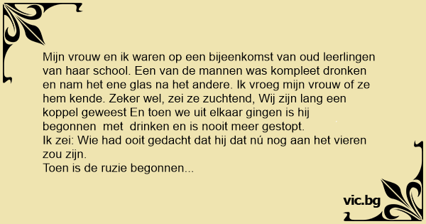 Mijn vrouw en ik waren op een bijeenkomst van oud leerlingen van haar school. Een van de mannen was kompleet dronken en nam het ene glas na het andere. Ik vroeg mijn vrouw of ze hem kende. Zeker wel, zei ze zuchtend, Wij zijn lang een koppel geweest En toen we uit elkaar gingen is hij begonnen met drinken en is nooit meer gestopt.
