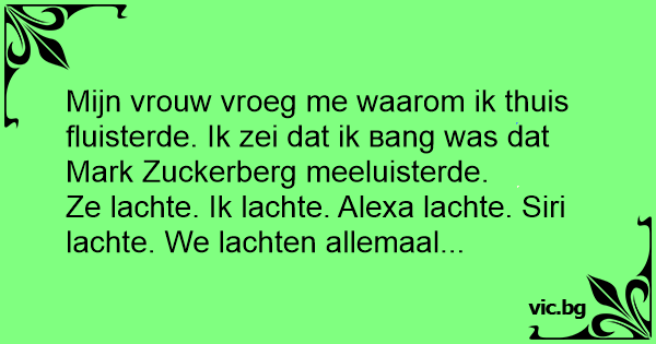Mijn vrouw vroeg me waarom ik thuis fluisterde. Ik zei dat ik ваng was dat Mark Zuckerberg meeluisterde.