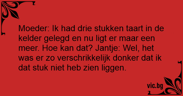Moeder: Ik had drie stukken taart in de kelder gelegd en nu ligt er maar een meer. Ное kan dat? Jantje: Wel, het was er zo verschrikkelijk donker dat ik dat stuk niet heb zien liggen.