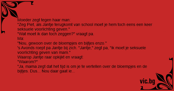 "Zeg Piet, als Jantje terugkomt van school moet je hem toch eens een keer seksuele voorlichting geven."
