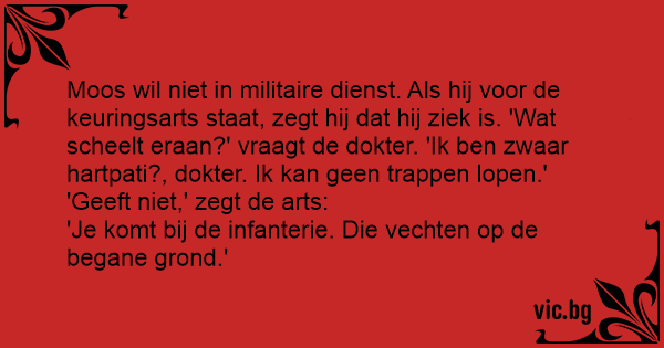 Moos wil niet in militaire dienst. Als hij voor de keuringsarts staat, zegt hij dat hij ziek is. 'Wat scheelt eraan?' vraagt de dokter. 'Ik ben zwaar hartpati?, dokter. Ik kan geen trappen lopen.'