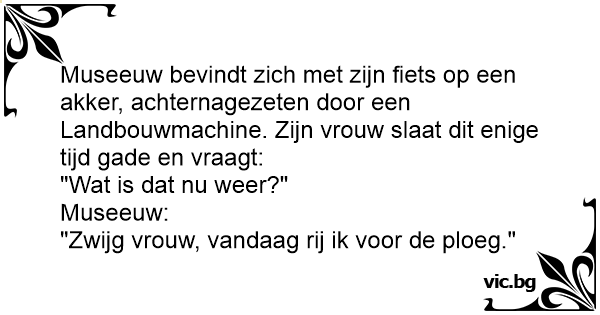 Museeuw bevindt zich met zijn fiets op een akker, achternagezeten door een<br />Landbouwmachine. Zijn vrouw slaat dit enige tijd gade en vraagt:<br />"Wat is dat nu weer?"<br />Museeuw:<br />"Zwijg vrouw, vandaag rij ik voor de ploeg."
