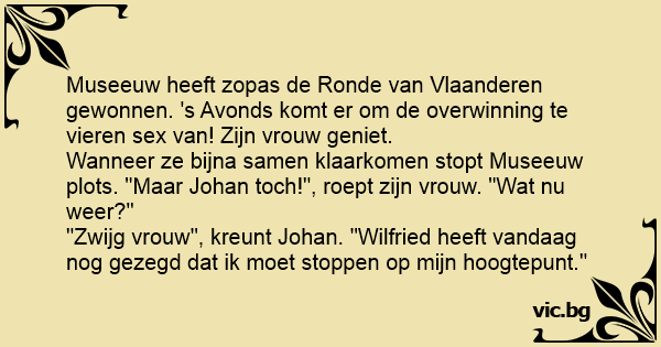 "Zwijg vrouw", kreunt Johan. "Wilfried heeft vandaag nog gezegd dat ik moet stoppen op mijn hoogtepunt."