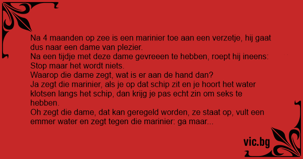 Dat kan ook geregeld worden, dus die dame pakt zich een dagblad, en rammelt met een hand in die emmer water, en met de andere hand wuift ze met de krant. Die marinier vindt het fantastisch, maar na een paar minuten roept hij weer: stop maar het wordt niets. Hoezo niet vraagt de dame.