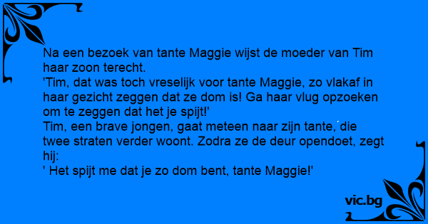 'Tim, dat was toch vreselijk voor tante Maggie, zo vlakaf in haar gezicht zeggen dat ze dom is! Ga haar vlug opzoeken om te zeggen dat het je spijt!'