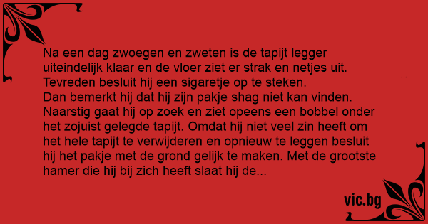 Dan bemerkt hij dat hij zijn pakje shаg niet kan vinden. Naarstig gaat hij op zoek en ziet opeens een bobbel onder het zojuist gelegde tapijt. Omdat hij niet veel zin heeft om het hele tapijt te verwijderen en opnieuw te leggen besluit hij het pakje met de grond gelijk te maken. Met de grootste hamer die hij bij zich heeft slaat hij de bobbel weg.