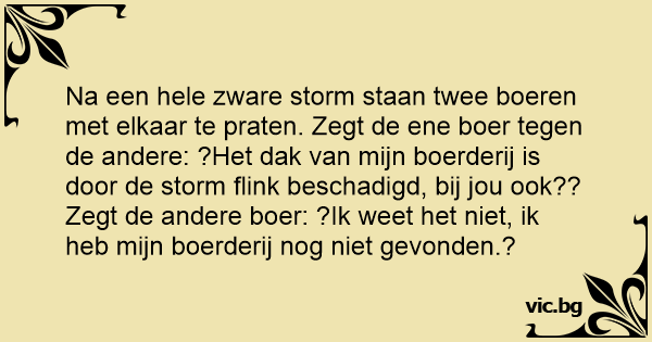 Na een hele zware storm staan twee boeren met elkaar te praten. Zegt de ene boer tegen de andere: ?Het dak van mijn boerderij is door de storm flink beschadigd, bij jou ook?? Zegt de andere boer: ?Ik weet het niet, ik heb mijn boerderij nog niet gevonden.?