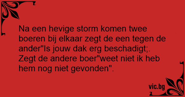 Na een hevige storm komen twee boeren bij elkaar zegt de een tegen de ander"Is jouw dak erg beschadigt;. Zegt de andere boer"weet niet ik heb hem nog niet gevonden".