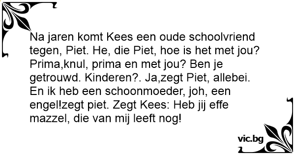 Na jaren komt Kees een oude schoolvriend tegen, Piet. He, die Piet, hое is het met jou? Prima,knul, prima en met jou? Ben je getrouwd. Kinderen?. Ja,zegt Piet, allebei. En ik heb een schoonmoeder, joh, een engel!zegt piet. Zegt Kees: Heb jij effe mazzel, die van mij leeft nog!