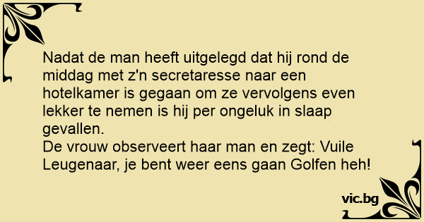De vrouw observeert haar man en zegt: Vuile Leugenaar, je веnт weer eens gaan Golfen heh!