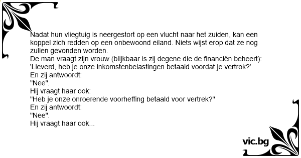 Un bateau fait naufrage. Un couple s'en sort et arrive sur une île déserte. Après avoir pris du repos, le mari demande à sa femme : - Chérie, avant de partir, as-tu payé nos impôts ? - Non. -...