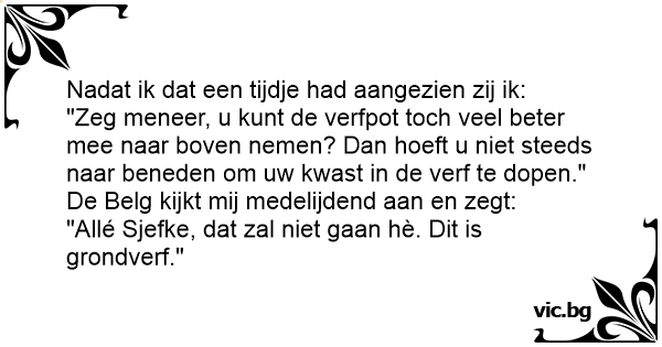 Nadat ik dat een tijdje had aangezien zij ik: "Zeg meneer, u кunт de verfpot toch veel beter mee naar boven nemen? Dan hoeft u niet steeds naar beneden om uw kwast in de verf te dopen." De Belg kijkt mij medelijdend aan en zegt: "Allé Sjefke, dat zal niet gaan hè. Dit is grondverf."