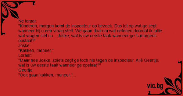 "Kinderen, morgen komt de inspecteur op bezoek. Dus let op wat ge zegt wanneer hij u een vraag stelt. We gaan daarom wat oefenen doordat ik jullie wat vragen stel nu... Joske, wat is uw eerste taak wanneer ge 's morgens opstaat?"