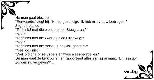 "Eerwaarde," zegt hij, "ik heb gezondigd. Ik heb m'n vrouw bedrogen."
