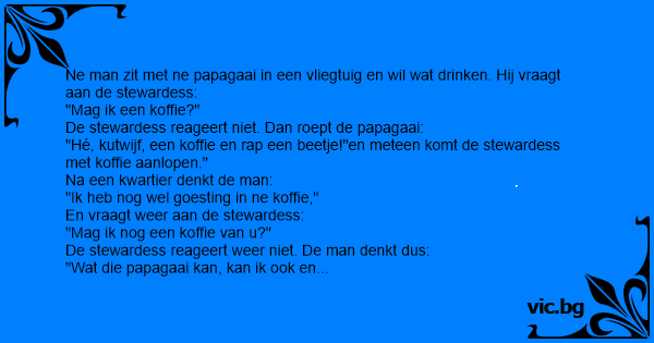 Er stapt een man in het vliegtuig en merkt dat er naast em een papagaai zit. Als de stewardess bij hem komt besteld ie een koffie en de papagaai krijst: "Een dubbele whisky en snel een beetje...