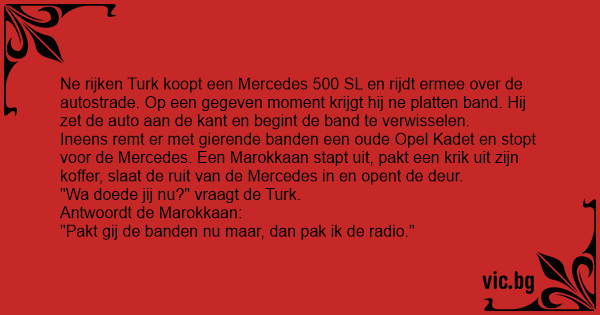 Ineens remt er met gierende banden een oude Opel Kadet en stopt voor de Mercedes. Een Marokkaan stapt uit, pakt een krik uit zijn koffer, slaat de ruit van de Mercedes in en opent de deur.