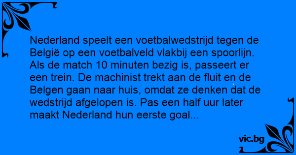 Nederland speelt een voetbalwedstrijd tegen de België op een voetbalveld vlakbij een spoorlijn. Als de match 10 minuten bezig is, passeert er een trein. De machinist trekt aan de fluit en de Belgen gaan naar huis, omdat ze denken dat de wedstrijd afgelopen is. Pas een half uur later maakt Nederland hun eerste goal...