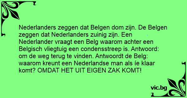 Nederlanders zeggen dat Belgen dom zijn. De Belgen zeggen dat Nederlanders zuinig zijn. Een Nederlander vraagt een Belg waarom achter een Belgisch vliegtuig een condensstreep is. Antwoord: om de weg terug te vinden. Antwoordt de Belg: waarom kreunt een Nederlandse man als íe klaar komt? OMDAT HET UIT EIGEN ZАК KOMT!